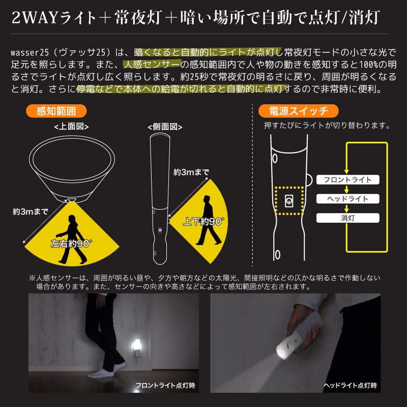・暗い場所でセンサーが作動!動きを感知して明るく点灯・約25秒で常夜灯に戻ります。