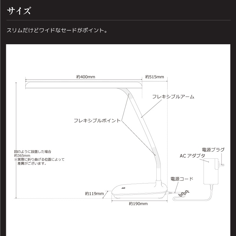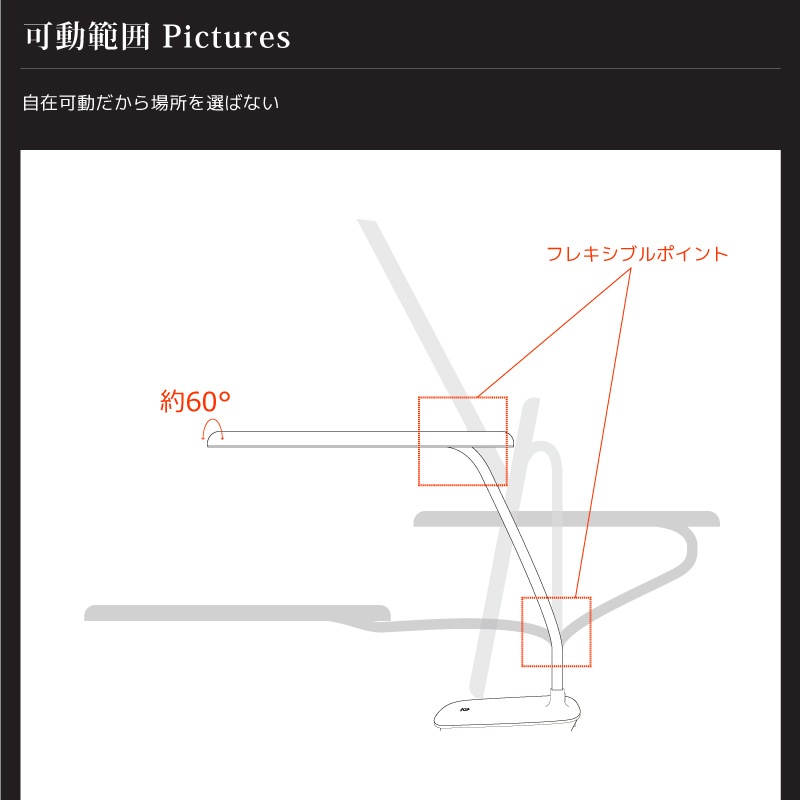 ・フレキシブルアームとチルト構造で照らしたい場所に明かりを。