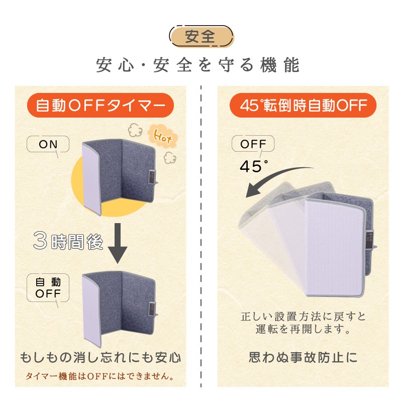 ●連続3時間使用した場合、自動で運転がOFFになります。もしもの消し忘れにも安心!