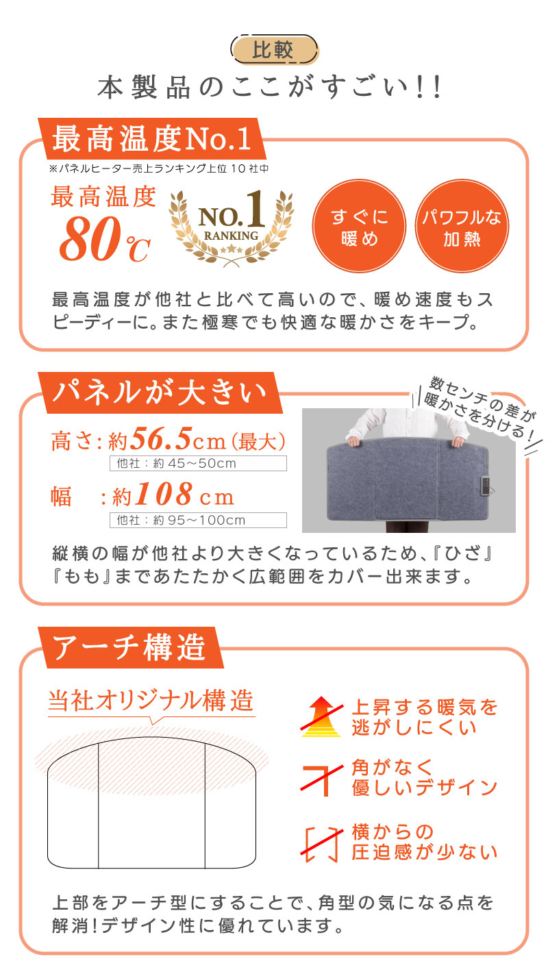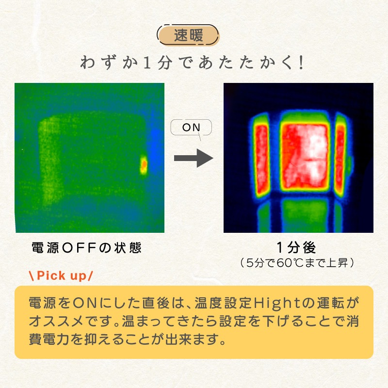 最高温度『約80℃』で、他社と比べて高いこともポイントのひとつ! 立ち上がりのあたためスピードが早く、わずか1分でパネル全体を発熱させ、5分後には表面温度約60℃まで達します。
