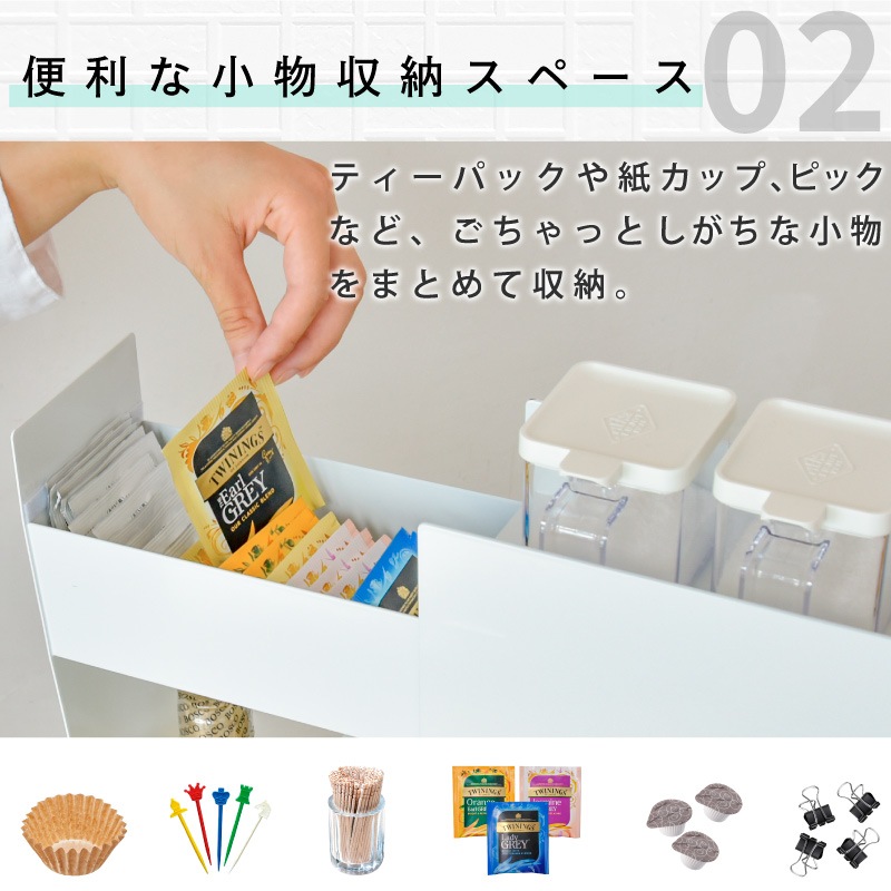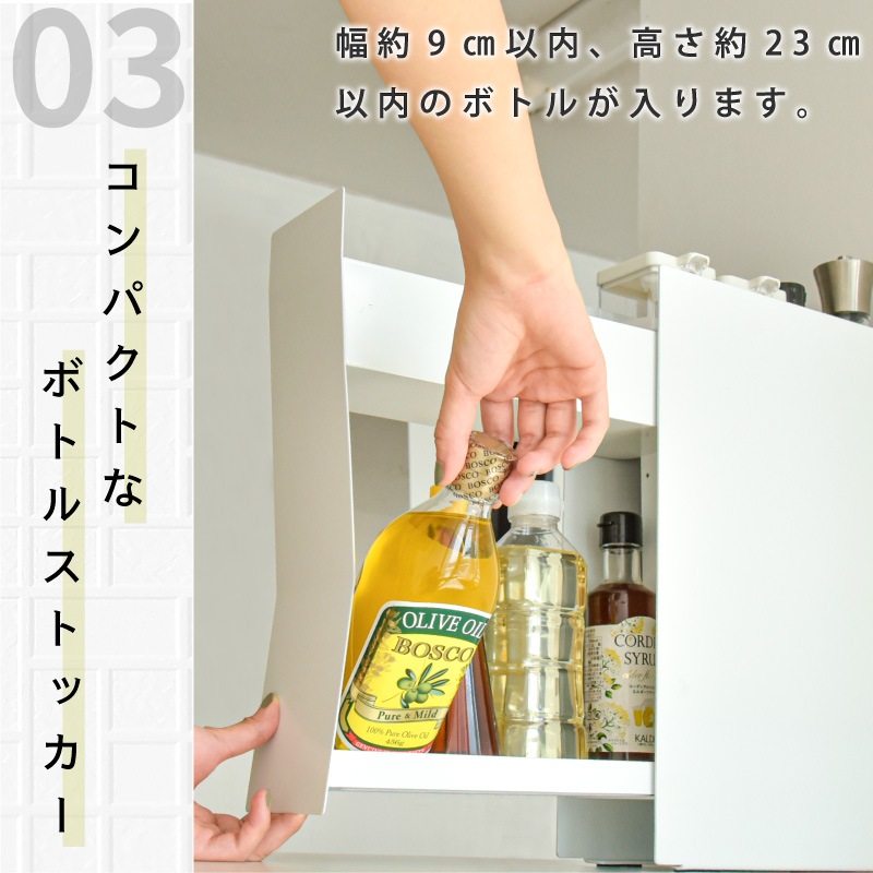 最上段にはよく使うスパイスや塩・砂糖を。油ハネ防止の壁で覆われているので、そのままコンロ横に置くよりも衛生的です。引き出しはサイズの異なる便利な2段式。紅茶パックやおかずカップ、爪楊枝、コンソメキューブなどの細々としたものは上に。サラダ油、胡麻油、みりんなどのボトル類は下に。