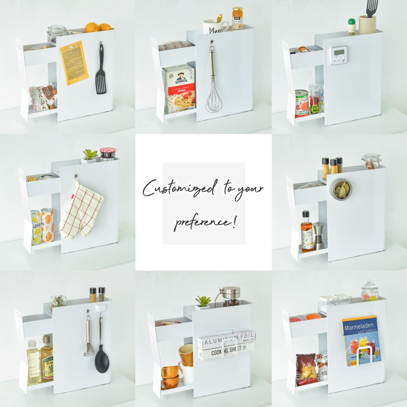 たったの『10cm』に全て収まる!溢れんばかりにあるコンロ横の調味料を、サッと隠してひとまとめ。サイズの異なる2段式なので、大きいものも小さいものも全て入ります。