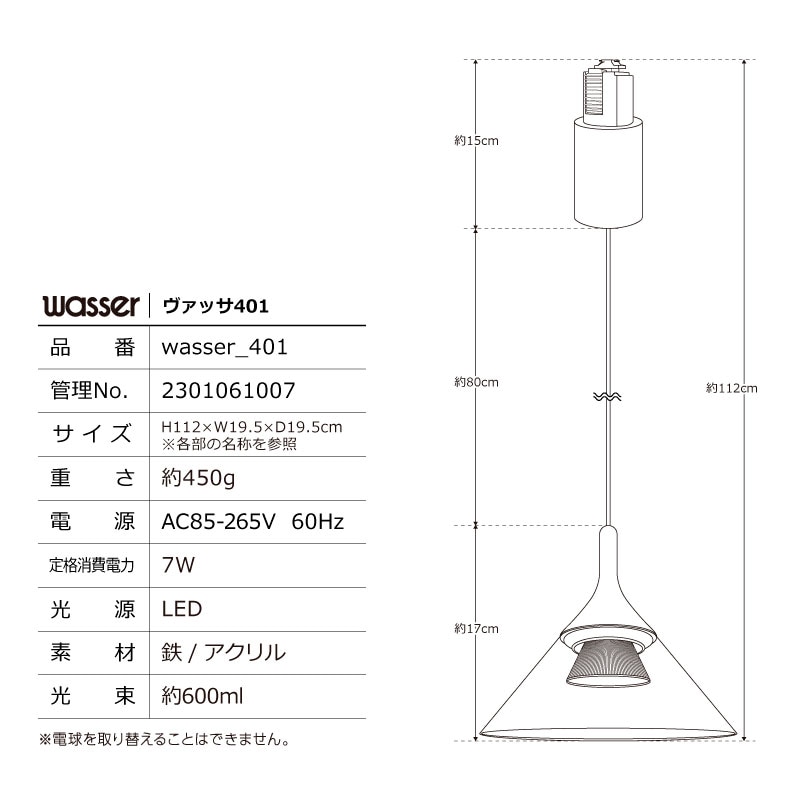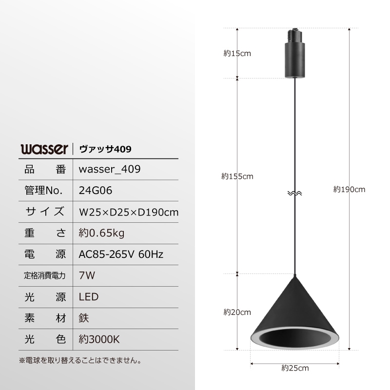 【wasser 401_シーリング/逆三角円錐】 ・サイズ:約W19.5×D19.5×H112cm ・重さ:約450g ・電源:AC85-265V 60Hz ・定格消費電力:7W ・光源:LED ・素材:鉄/アクリル ・光束:約600lm ・生産国:Made in China 【wasser 409_シーリング/円錐リング】 ・サイズ:約W13×D13×H196cm ・重さ:約650g ・電源:AC85-265V 60Hz ・定格消費電力:7W ・光源:LED ・素材:鉄 ・光色:約3000K ・生産国:Made in China 【wasser 410_シーリング/マグネットボール】 ・サイズ:W12×D12×H190cm ・重さ:約600g ・電源:AC85-265V 60Hz ・定格消費電力:7W ・光源:LED ・素材:鉄 ・光色:約3000K ・生産国:Made in China |