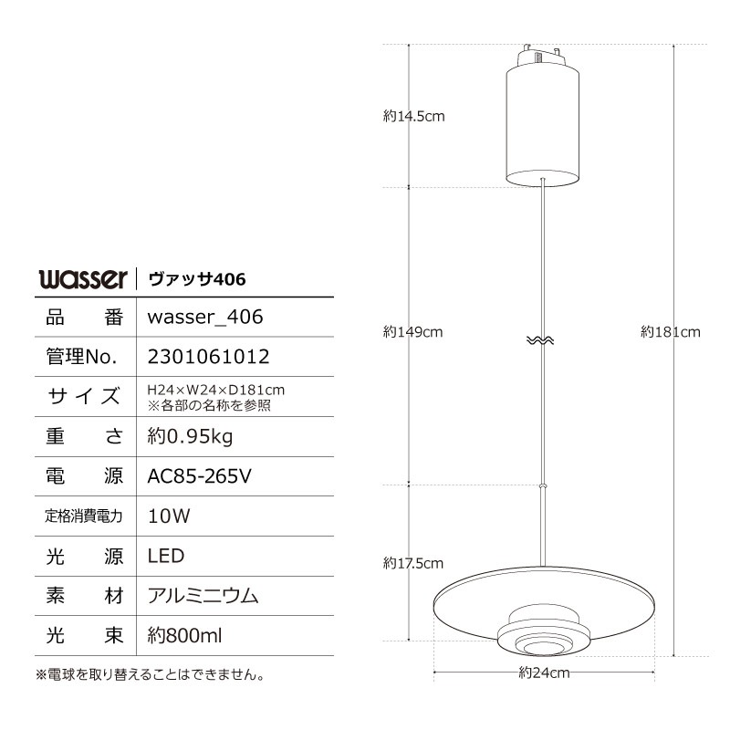 ・サイズ:W24×D24×H181cm ・重さ:約約0.95kg ・電源:AC85-265V ・定格消費電力:10W ・光源:LED ・素材:アルミニウム ・光束:約800lm ・生産国:Made in China |
