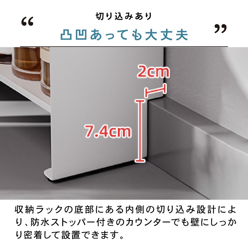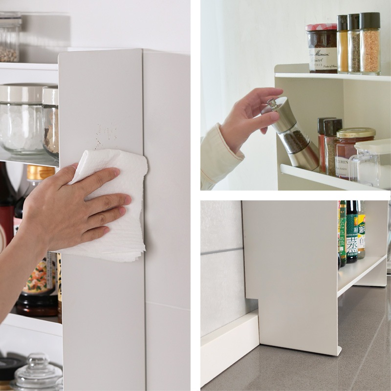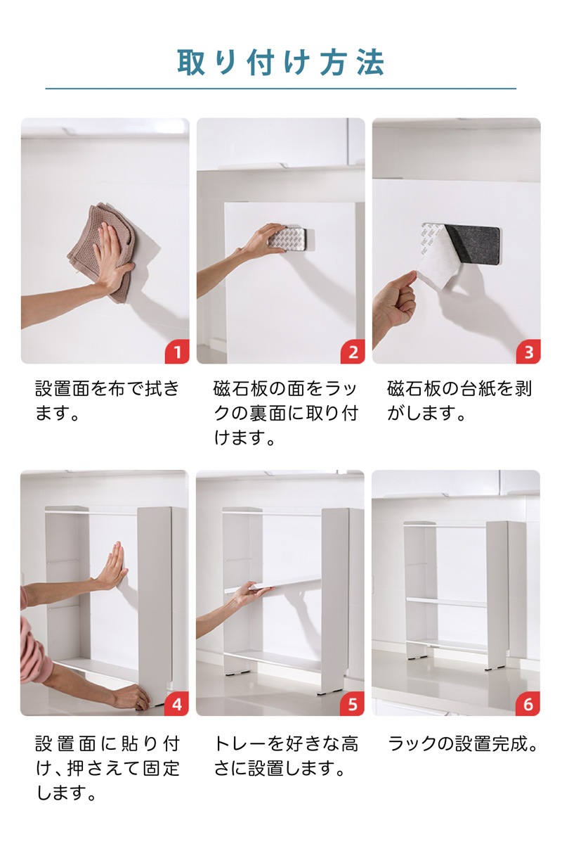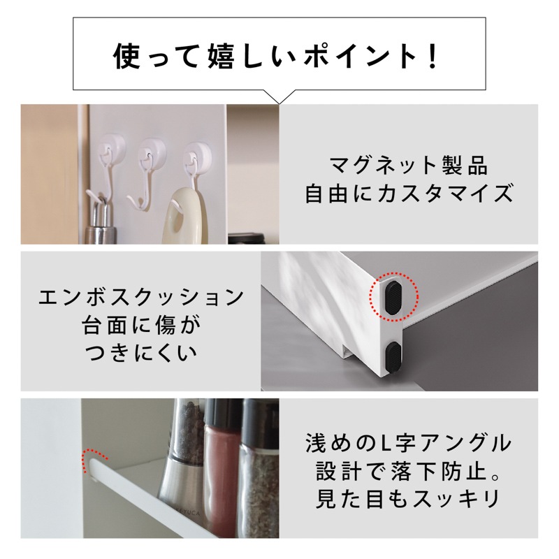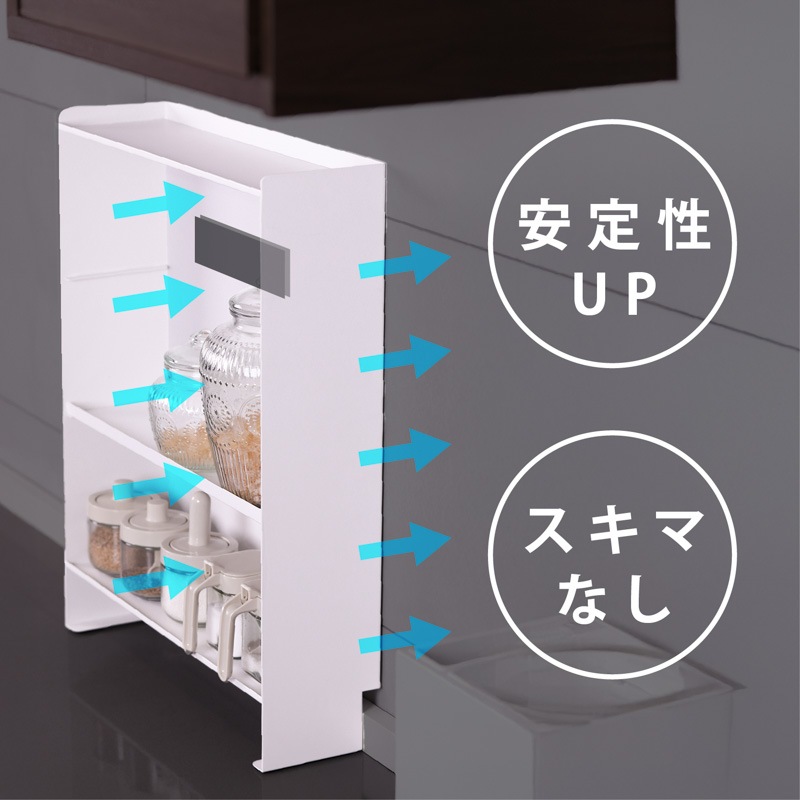 マグネットで壁にピタッ!省スペースでも大容量なスリムシェルフ 1. 壁にピタッとくっつくマグネット付き! - 両面テープ付きの大判強力マグネットが付いてきます。マグネットをお好きな箇所に配置、スチール製の棚をガッチリ固定。設置位置を自分で決められます。 - 工事不要、取り付けカンタン!落ちにくく、安定感も抜群。 2. 可動式の中板付き。全部で3段の大容量収納! - サイドの空間をしっかり活用し、調味料や真空パック、小物類をたっぷり収納可能。 - 省スペースでも最大限の収納力を発揮! 3. - 収納するアイテムに合わせて高さを変更できるため、背の高いボトルや小物もすっきり収納。 - 用途に応じた自由なレイアウトが可能! 【収納ラックの壁面側にあるくぼみ設計】 防水ストッパー付きのカウンターでも壁にしっかり密着して設置できます。 |