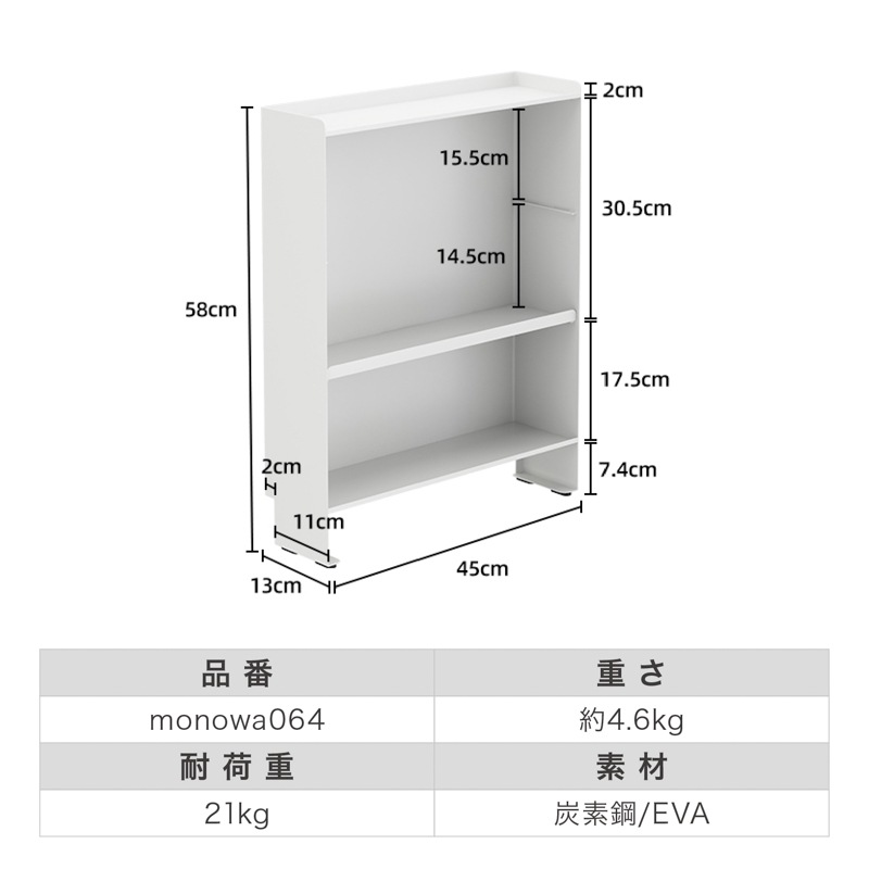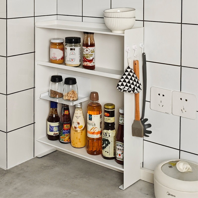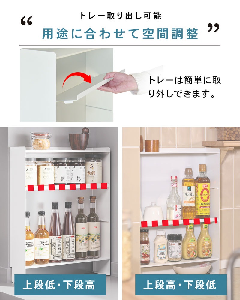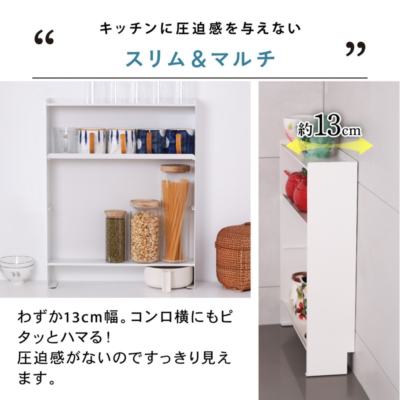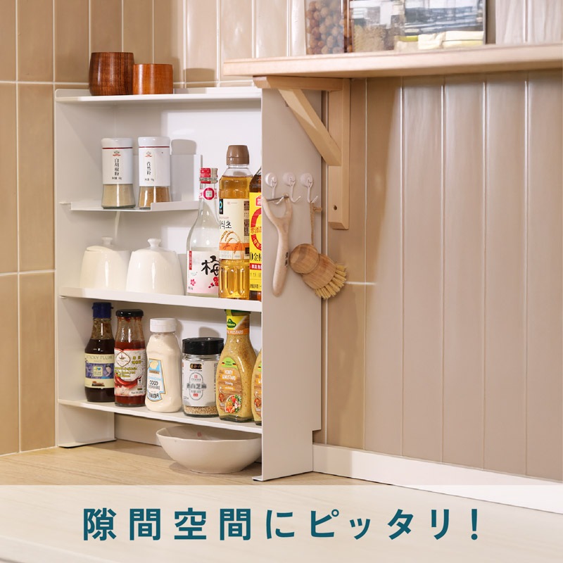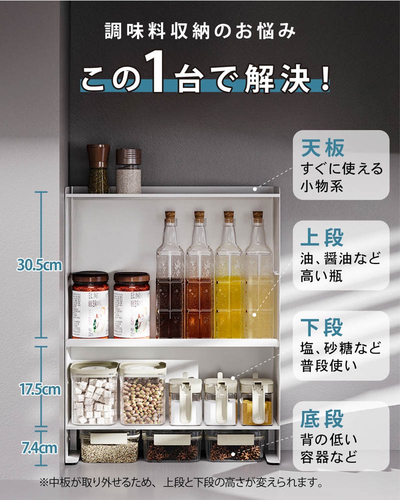 マグネットで壁にピタッ!省スペースでも大容量なスリムシェルフ 1. 壁にピタッとくっつくマグネット付き! - 両面テープ付きの大判強力マグネットが付いてきます。マグネットをお好きな箇所に配置、スチール製の棚をガッチリ固定。設置位置を自分で決められます。 - 工事不要、取り付けカンタン!落ちにくく、安定感も抜群。 2. 可動式の中板付き。全部で3段の大容量収納! - サイドの空間をしっかり活用し、調味料や真空パック、小物類をたっぷり収納可能。 - 省スペースでも最大限の収納力を発揮! 3. - 収納するアイテムに合わせて高さを変更できるため、背の高いボトルや小物もすっきり収納。 - 用途に応じた自由なレイアウトが可能! 【収納ラックの壁面側にあるくぼみ設計】 防水ストッパー付きのカウンターでも壁にしっかり密着して設置できます。 |