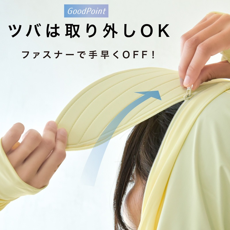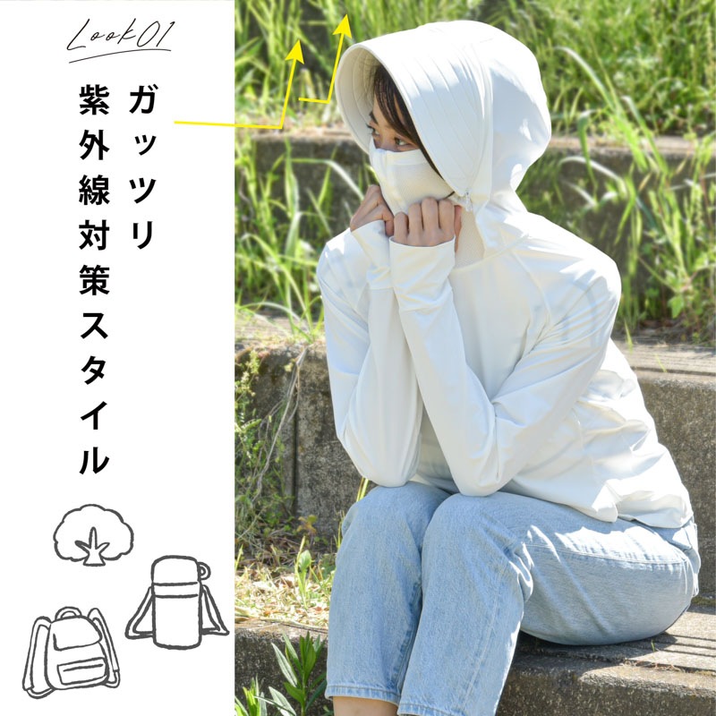 ファスナーを上げて帽子をかぶれば、顔まわりまでしっかりUVブロック。 帽子のツバを外せば、スタンダードなフードパーカーとして普段使いにも。 お出かけ・作業・ルームウェアまで、シーンを問わず活躍します。