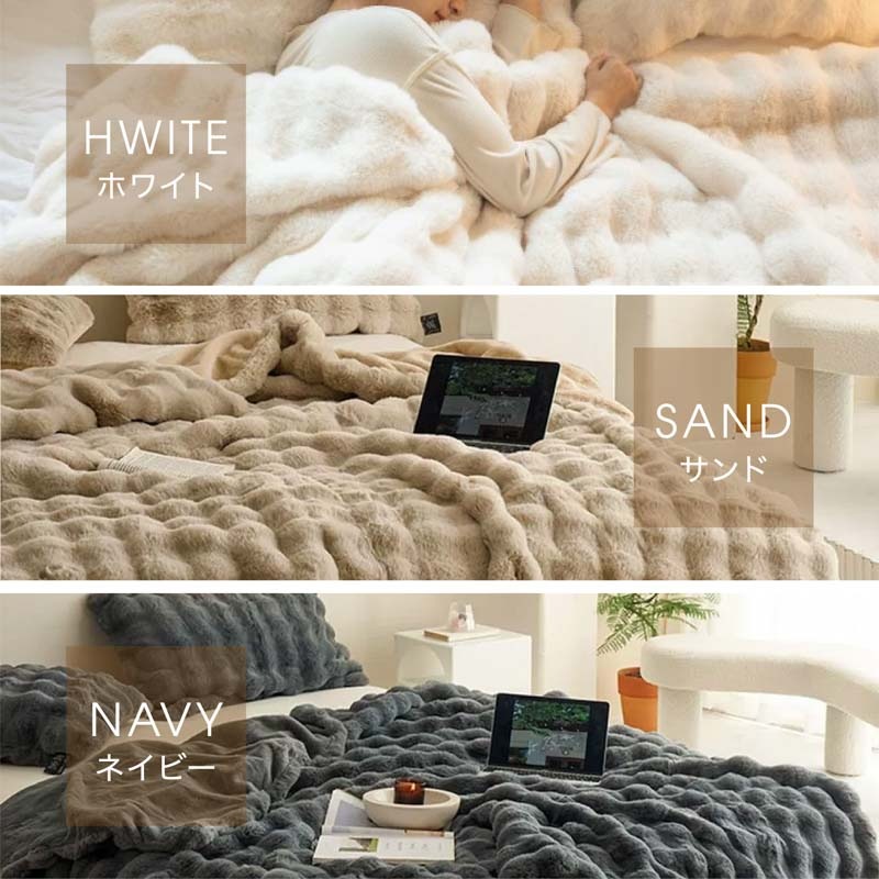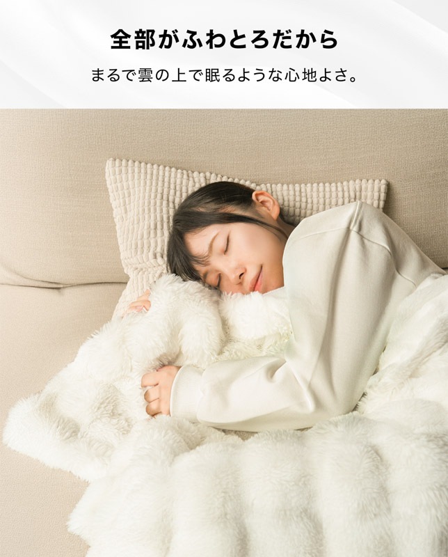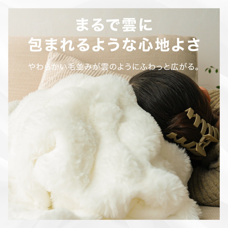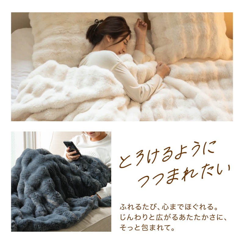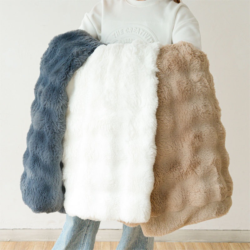 心までほぐれるようなぬくもりが、毎日の暮らしにやさしく寄り添います。 ●高密度フランネル×なめらか裏地の二重構造。 保温性を高めながら、さらりとした通気性もキープ。 ●毛足の長いファーが空気を含み、 軽やかなのにしっかりあたたかい。 ●お昼寝や読書、映画鑑賞にぴったり。 ソファでもベッドでも、自分だけの“ME TIME”をやさしく包みます。 ●寒い冬はもちろん、春や秋の肌寒い季節にも。 エアコン冷え対策や夏のひんやり空気にもおすすめ。 ●静電気軽減加工で冬のパチッと感を防ぎ、 肌にも衣類にもやさしい仕上がりです。 ●お手入れもかんたん。いつでも清潔。 洗ってもふわふわ感が長く続きます。 ●スナチュラルな3色(サンド・ホワイト・ネイビー)が、 お部屋になじみながら上品な雰囲気を演出。 ●膝掛けに、ブランケットに、ベッドカバーに。 使い方を選ばない、あたたかさの定番。 |