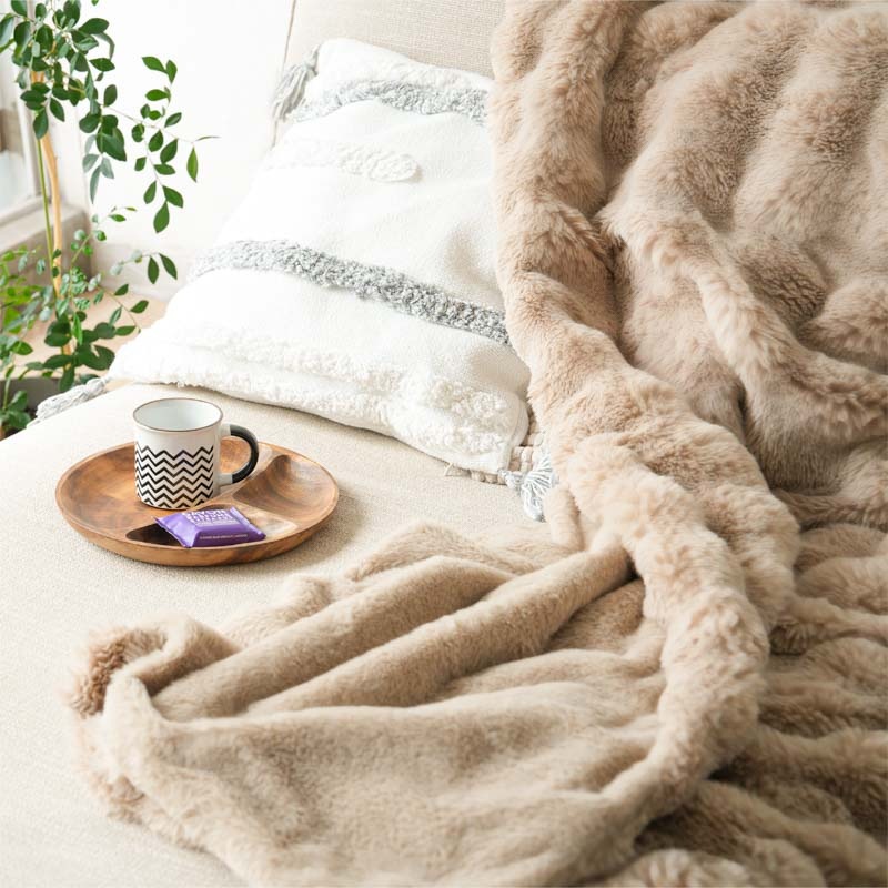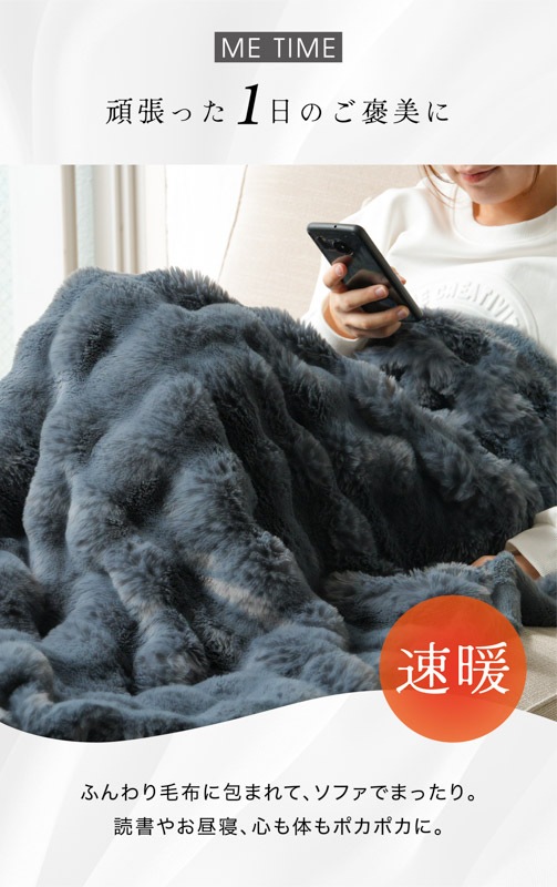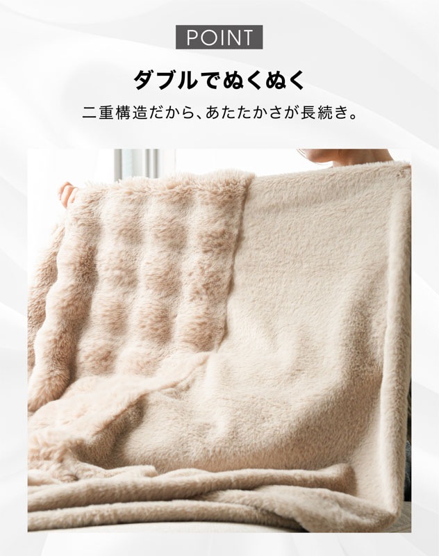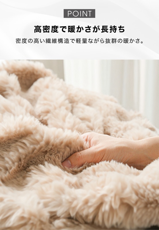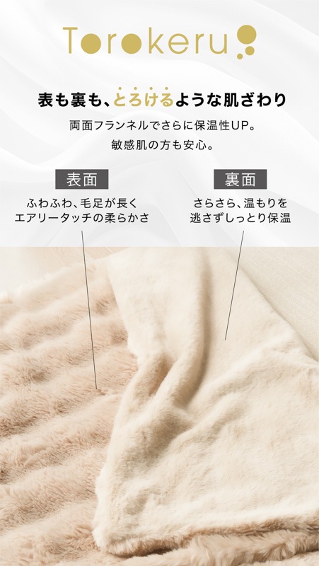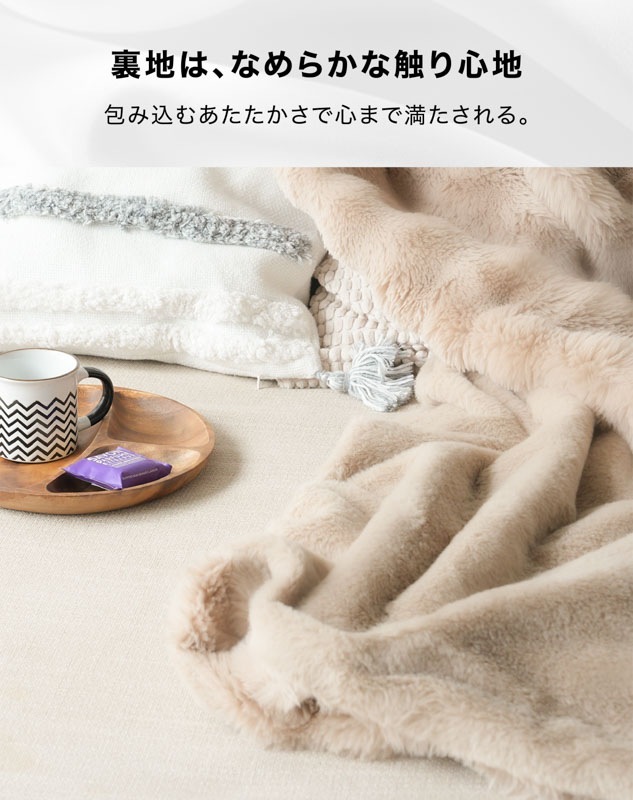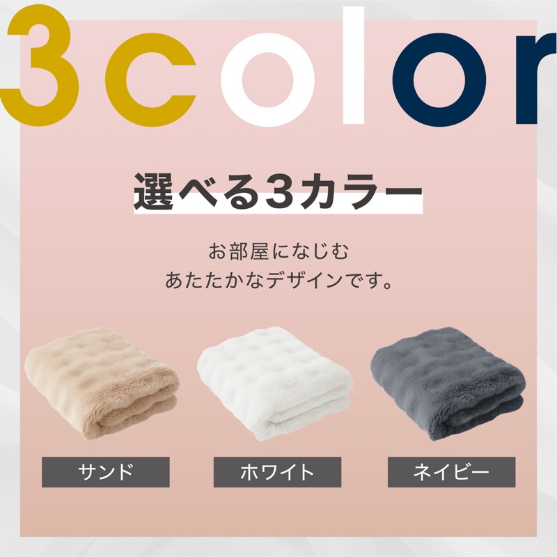 心までほぐれるようなぬくもりが、毎日の暮らしにやさしく寄り添います。 ●高密度フランネル×なめらか裏地の二重構造。 保温性を高めながら、さらりとした通気性もキープ。 ●毛足の長いファーが空気を含み、 軽やかなのにしっかりあたたかい。 ●お昼寝や読書、映画鑑賞にぴったり。 ソファでもベッドでも、自分だけの“ME TIME”をやさしく包みます。 ●寒い冬はもちろん、春や秋の肌寒い季節にも。 エアコン冷え対策や夏のひんやり空気にもおすすめ。 ●静電気軽減加工で冬のパチッと感を防ぎ、 肌にも衣類にもやさしい仕上がりです。 ●お手入れもかんたん。いつでも清潔。 洗ってもふわふわ感が長く続きます。 ●スナチュラルな3色(サンド・ホワイト・ネイビー)が、 お部屋になじみながら上品な雰囲気を演出。 ●膝掛けに、ブランケットに、ベッドカバーに。 使い方を選ばない、あたたかさの定番。 |