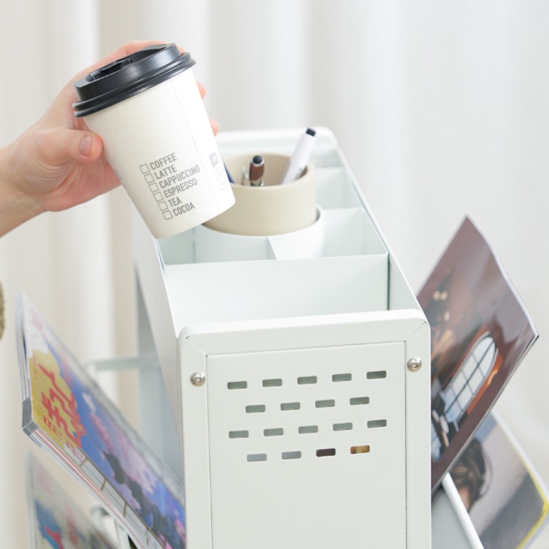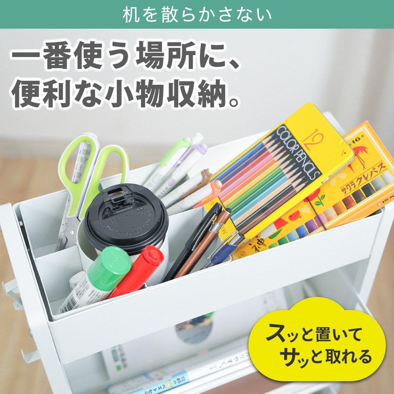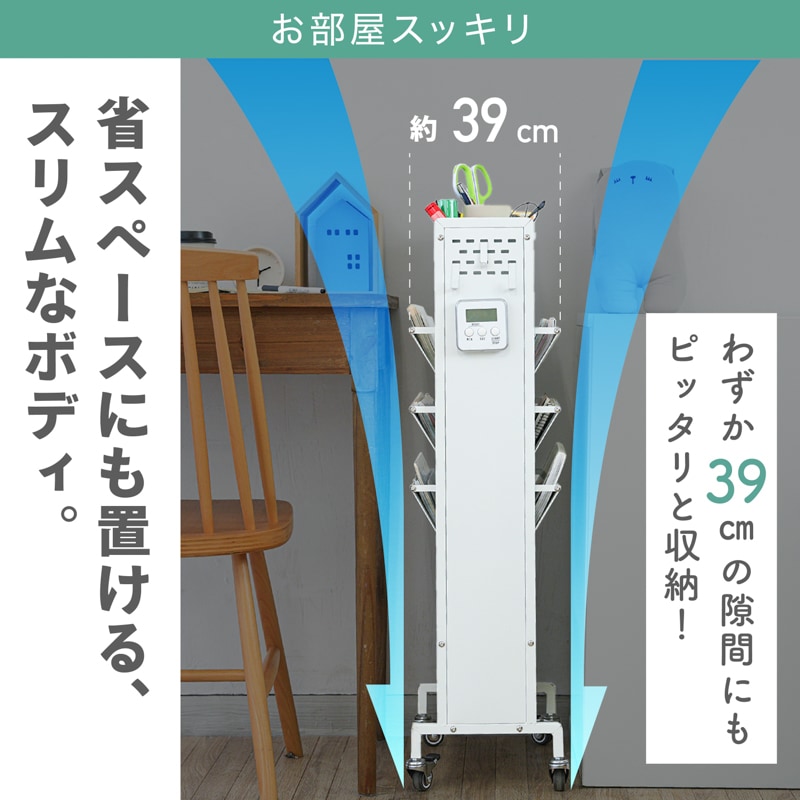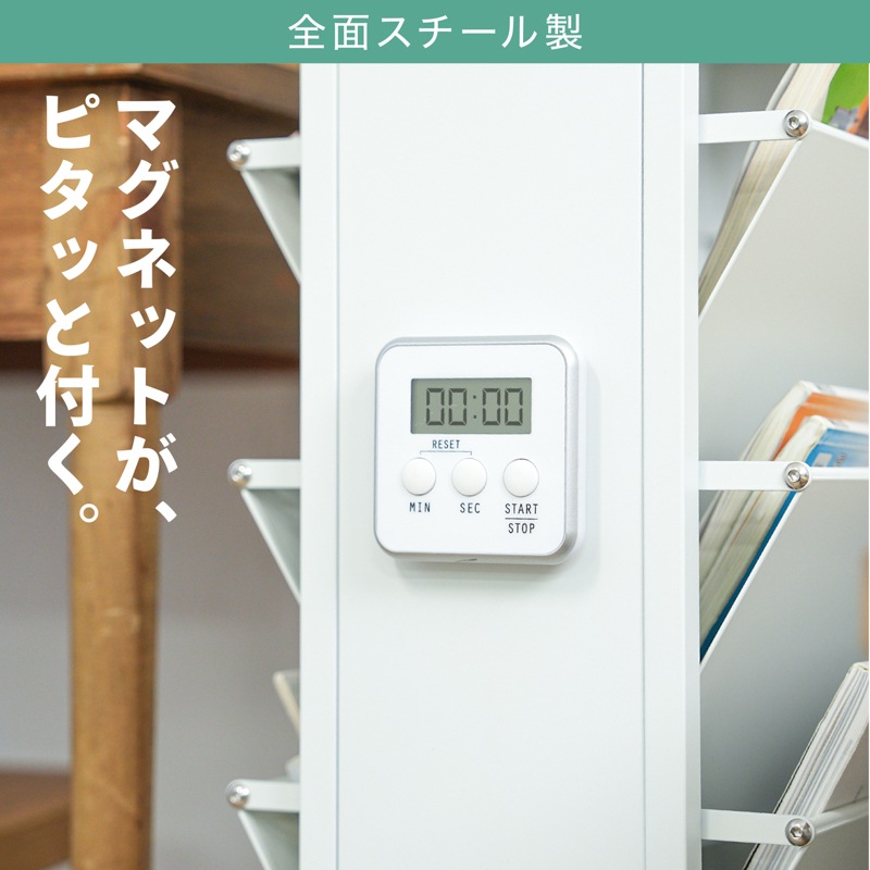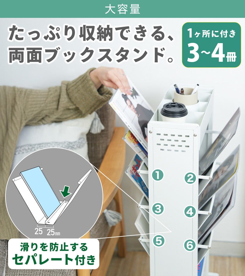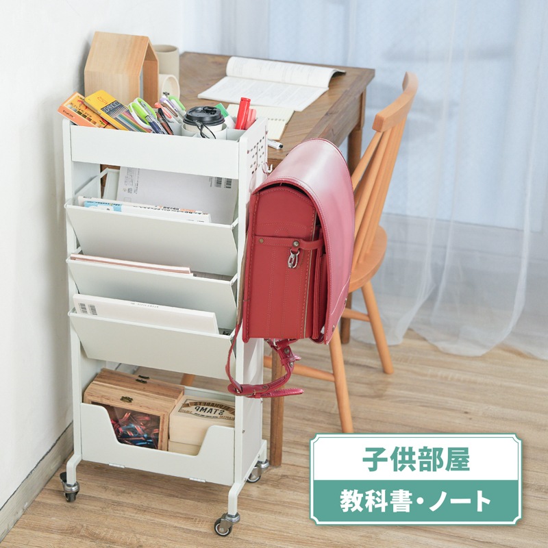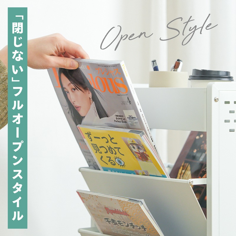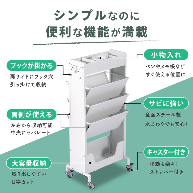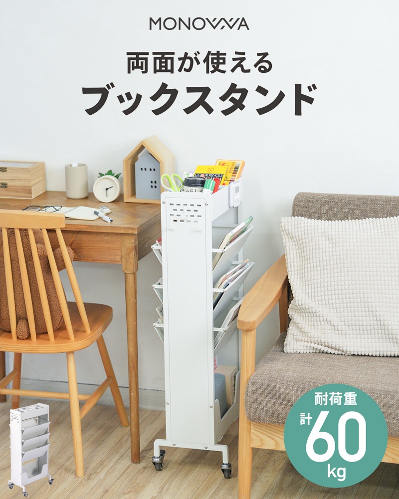 教科書も、雑誌も、スリムに収納。 小物入れもついた、大容量のブックスタンド ●閉じる動作のいらない、フルオープンスタイル ●耐荷重は合計60kgで、安心の収納力。 ●上段には、スライドもできる小物入れ。 ●中段には、両側から入れられる6つのブックスタンド。 ●下段には、大きな物でも収納できる広めのスペース。 ●サビに強いスチール素材を採用。マグネットもピタッと。 ●横幅約39cmのスリム設計で、お部屋スッキリ。 ●キャスター付きで移動もスムーズ。 ●サイドに物がかけられるフック付き。 ●子供部屋や、リビングなど。あらゆるシーンに。 暮らしを便利にしてくれるデザインシリーズ「monowa(モノワ)」から、両面収納のブックスタンドが登場! 【満足の耐荷重約60kg】※合計 学校で使う教科書やノートと、ペンなどの文房具をまとめて収納できるアイテム。耐荷重60kgだから、たくさん載せても安心。キャスター付きで移動もラクラク。 ※バスケットの上段部や手前に重いものを入れたり置いたりすると、ラックが転倒する恐れがあります。 底面バスケットに重いものを入れて使用すると安定しやすくなります。 |