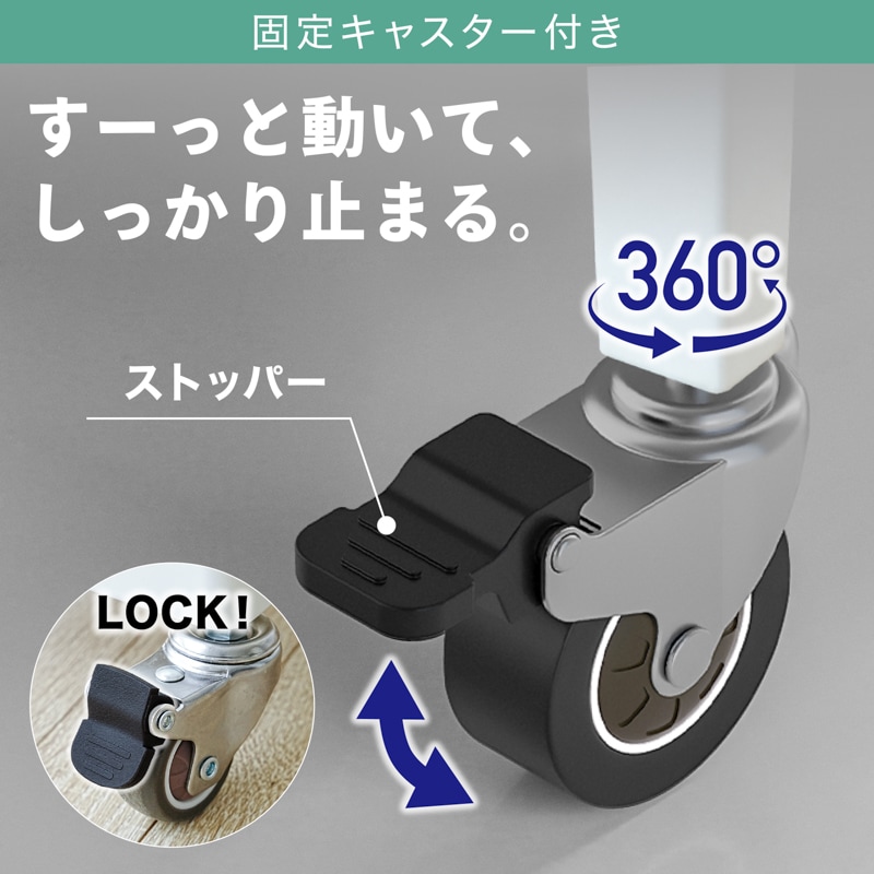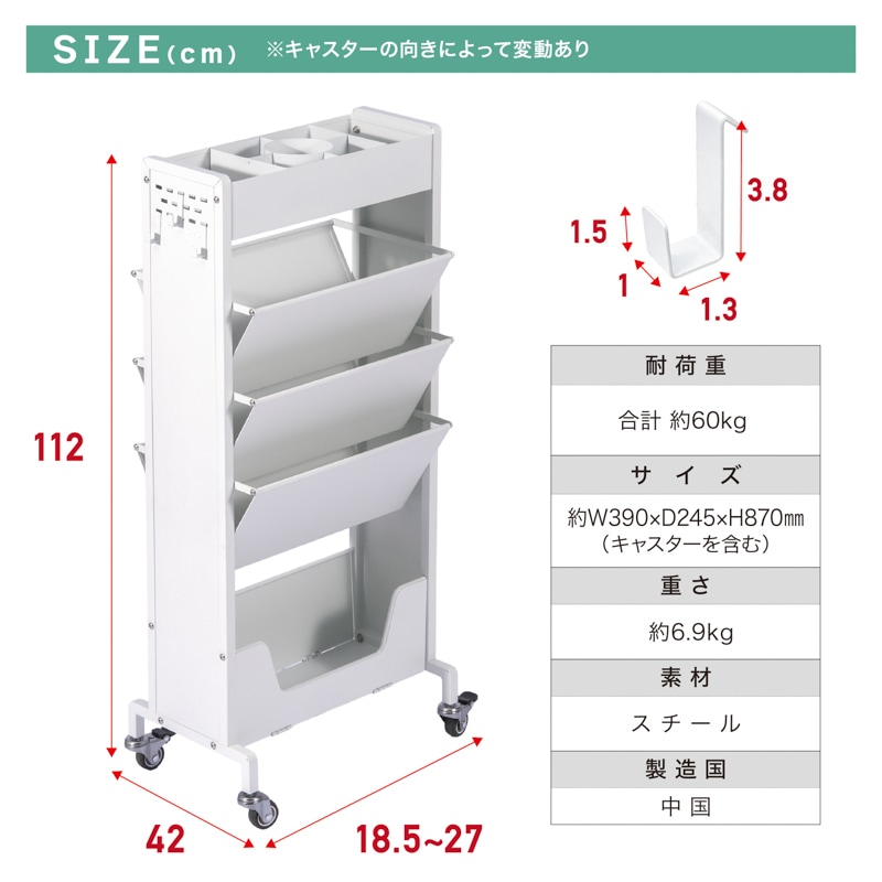 ・外寸:約W390×D245×H870mm ※キャスターの向きで可変 ・重さ:約6.9kg ・耐荷重:合計約60kg ・素材:スチール ・生産国:Made in China |