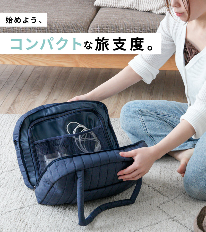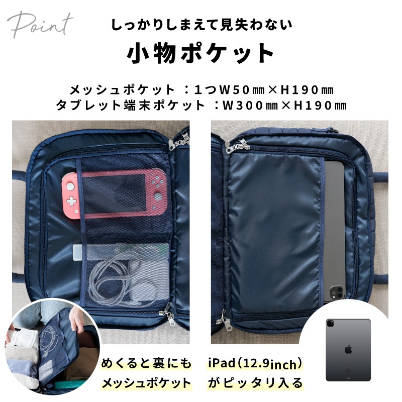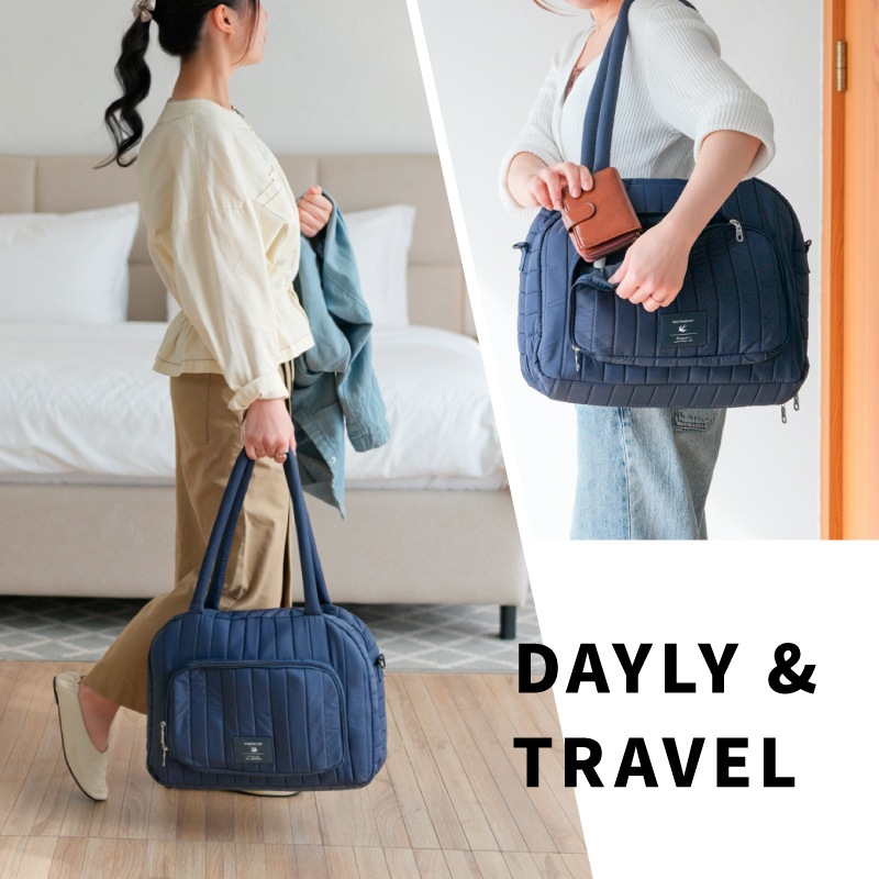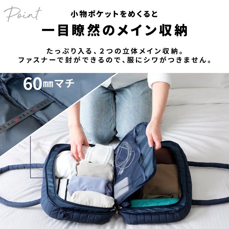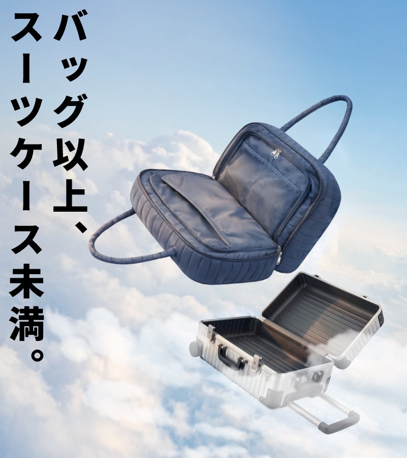 スーツケースより身軽、ハンドバッグ以上の収納力。 “たちまち旅”をスマートにする、トラベルスーツバッグです。 ●本のようにパカっと開く設計で、中身が一目瞭然。探す・取り出すがスムーズ。 ●たっぷり入る2つの立体メイン収納。ファスナーで封ができ、衣類にシワがつきにくい構造。 ●小物ポケットをめくるとメイン収納が登場。整理したままアクセス可能。 ●両面メッシュポケットで小物が迷子にならない。裏返しても使える仕様。 ●PCやタブレットはセンターに“サンド”収納。衣類がクッション代わりになり安心。 ●前面にはダブルファスナーの大きな2口ポケット。電車内や移動中でもサッと取り出せます。 ●柔らかく馴染みの良いナイロン生地。つい入れすぎてもファスナーが閉まりやすい。 【持ち運びも快適】 ふわっとしたウレタン入り持ち手で、肩への負担を軽減。 ショルダーベルト付きで両手フリーもOK。 【キャリーオン対応】 背面スリーブ付きでスーツケースに固定可能。 移動の多い旅行や出張の強い味方です。 |